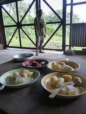 Nous allons en premier lieu apprendre, comment à partir d’un arbre, le sagoutier, extraire un des éléments majeurs de l’autosubsistance sur la côte. Abattre l’arbre est la première manœuvre avant d’enlever l’écorce sur la totalité de sa longueur. Grâce à des outils, ils découpent ensuite le tronc en petit copeaux. La dernière étape de la préparation consiste à extraire l’amidon grâce à un système de filtre utilisant des tissus poreux, de l’eau et un pressage manuel. Ils peuvent par la suite stocker le produit, le partager entre les différentes familles et l’utiliser le moment venu. La cohésion est forte dans le village. Ils se partagent de nombreuses tâches utiles pour la communauté et que chacun mettra «la main à la patte», même les chefs de village ou les personnes plus importantes, en ne faisant aucune distinction de rang social quel que soit le travail et sa difficulté. Cet esprit de groupe, loin d’objectifs purement personnels et individualistes, sera renforcé, quand après l’effort, nous sommes invités à partager un repas avec tous les travailleurs. Autour de la table de grands plats de riz avec différents accompagnement tournent dans les mains de chacun. Le partage est une règle de base.