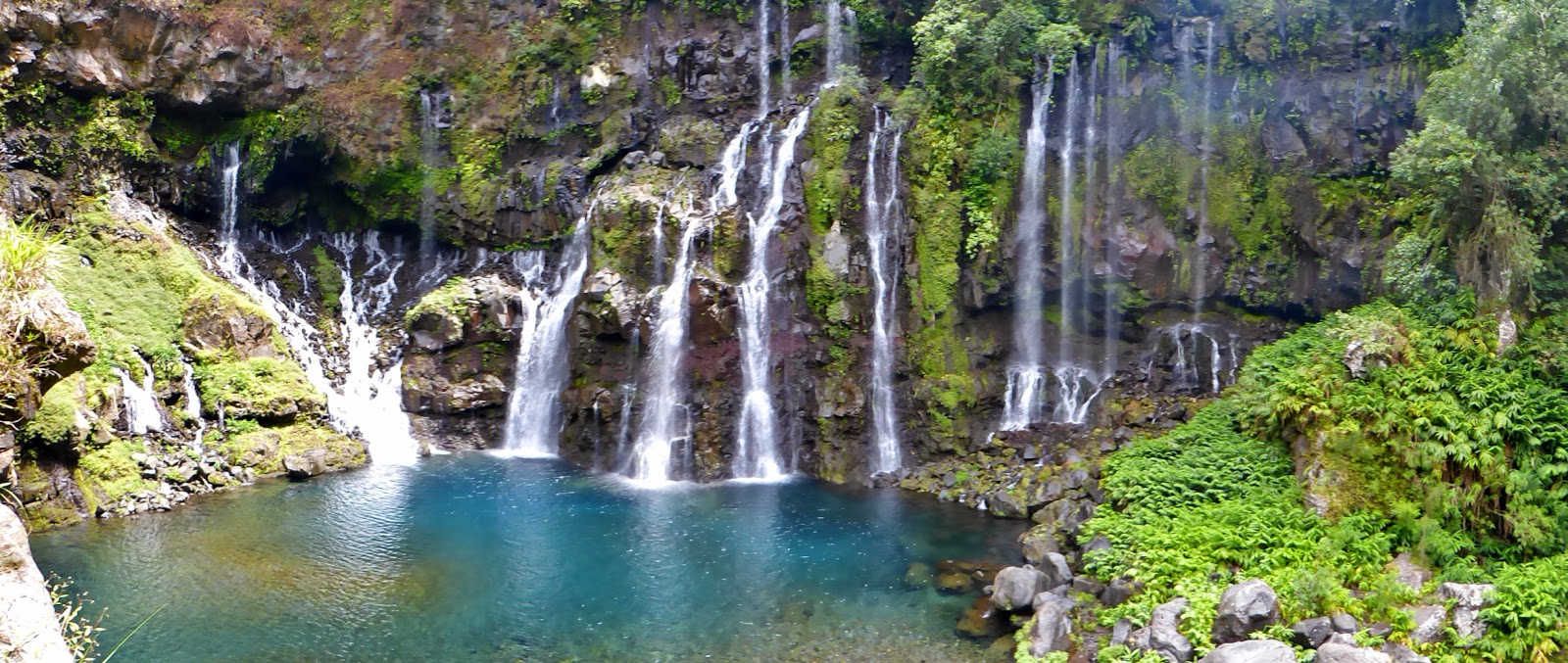 La matinée, qui avait commencée tôt, va finalement passer très vite. Une dame, discutant sur le pas de sa porte avec une voisine, m’ouvre sans problème sa porte. Pendant que la batterie recharge, nous échangeons sur la vision qu’elle a de son île, des évolutions qui ont transformées cette dernière les années passées, sur la vie au quotidien… Elle m’offre généreusement à boire et à manger. Nous passons un moment très agréable. Je la remercie chaleureusement, après plus d’une demi-heure, puis je repars de nouveau vers cette fameuse cascade. Je ne me lasse pas de ces paysages que j’admire à chaque fois différemment. Même quand je repasse au même endroit, je les regarde avec un autre point de vue. Après une nouvelle heure passée dans cette ravine, me voilà de nouveau, près de la cascade du Chaudron. Un premier basin est visible, en contre-bas, avec une petite cascade. La couleur de l’eau est d’un bleu resplendissant. Puis je rejoins l’attraction majeure des lieux; deux bassins, qui sont logés en fond de cette gorge, avec un aplomb rocheux de plus de 100 mètres. Malgré la magie des lieux, un doute plane pour moi! Rien ne le laisse présager ce qui va se passe lors de mon arrivée. Je commence à observer ces beautés naturelles. Mais cette cascade et son bassin sont classés comme des lieux très dangereux, surtout après que des pluies soient intervenues.